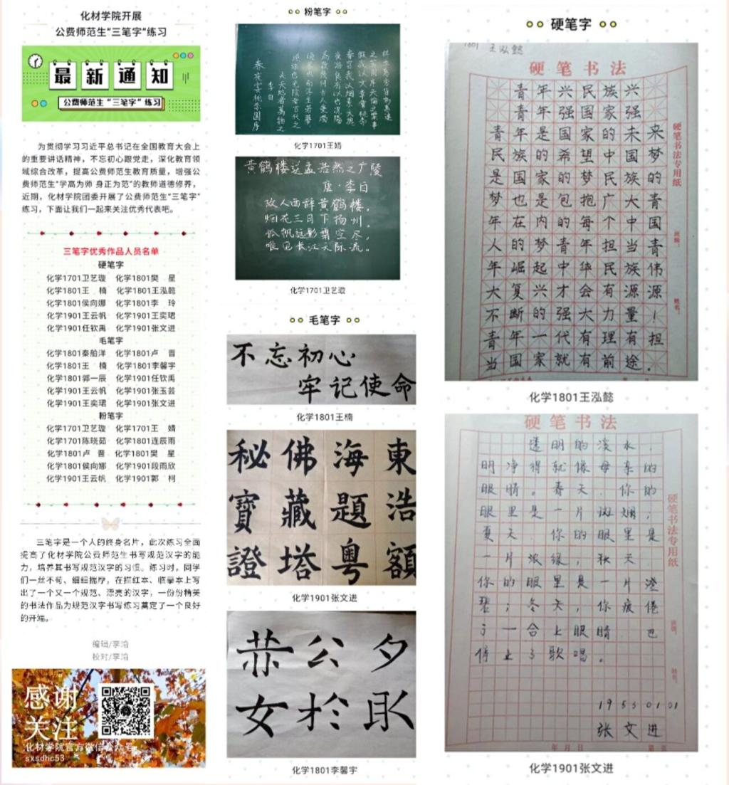 三笔字书写是教师传承优秀传统文化、传授知识信息、传播审美观念、塑造自身形象的重要载体。自2019年9月以来,新葡的京官网团委在公费师范生中开展三笔字书写技能培训活动,采取个人练习与专家讲座相结合的方式,由专业书法人员定期对作品进行点评,并评选出优秀作品在公众号展示。截至目前,该项活动累计开展4次,微信推送4次,累计参与688人次,微信点赞量522人次,浏览量1503人次。作品展现了新葡的京官网学子的书写风采,彰显了学子们对“持中秉正”师德的追求,同学们纷纷表示今后将加强三笔字练习,提高综合素质。